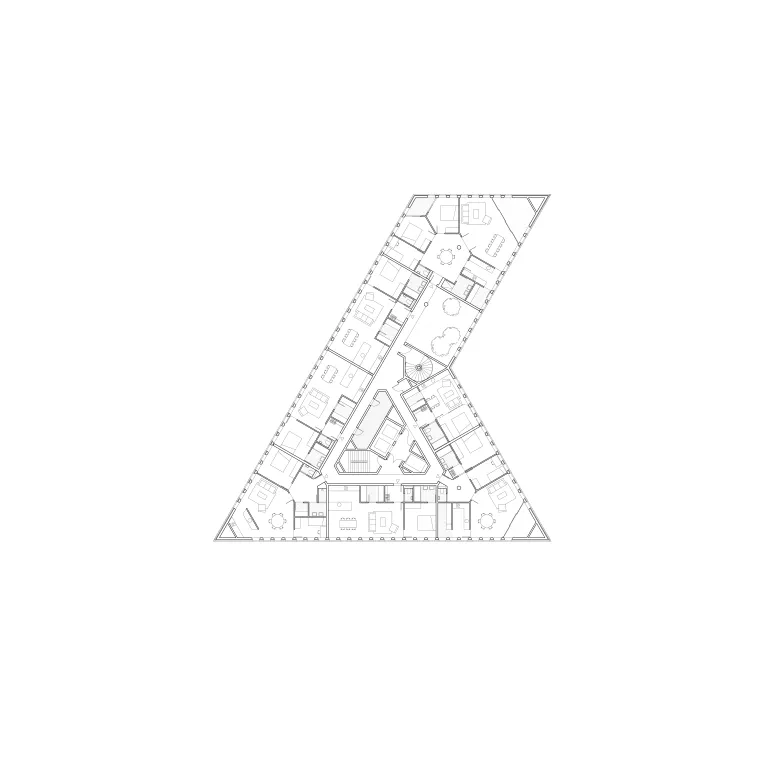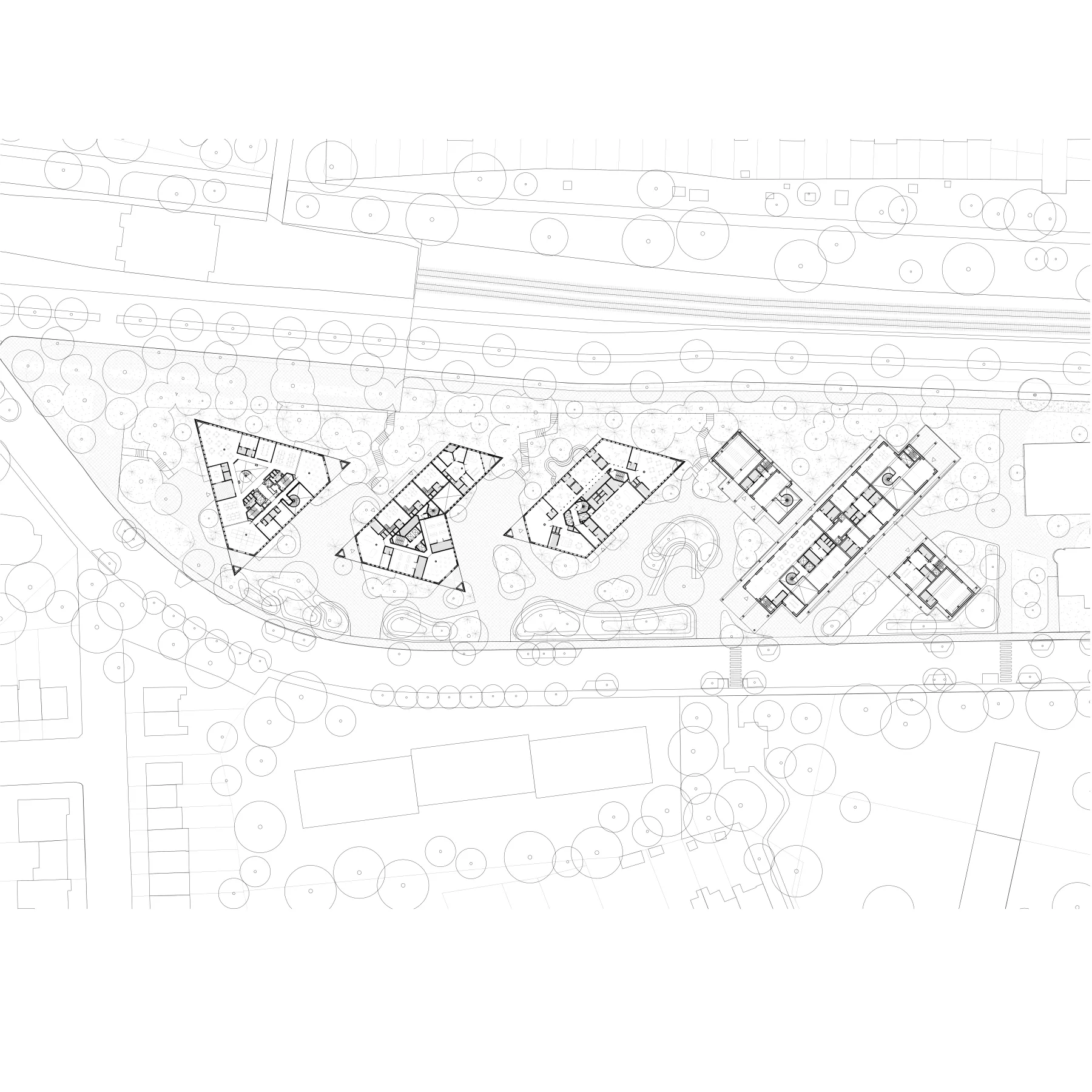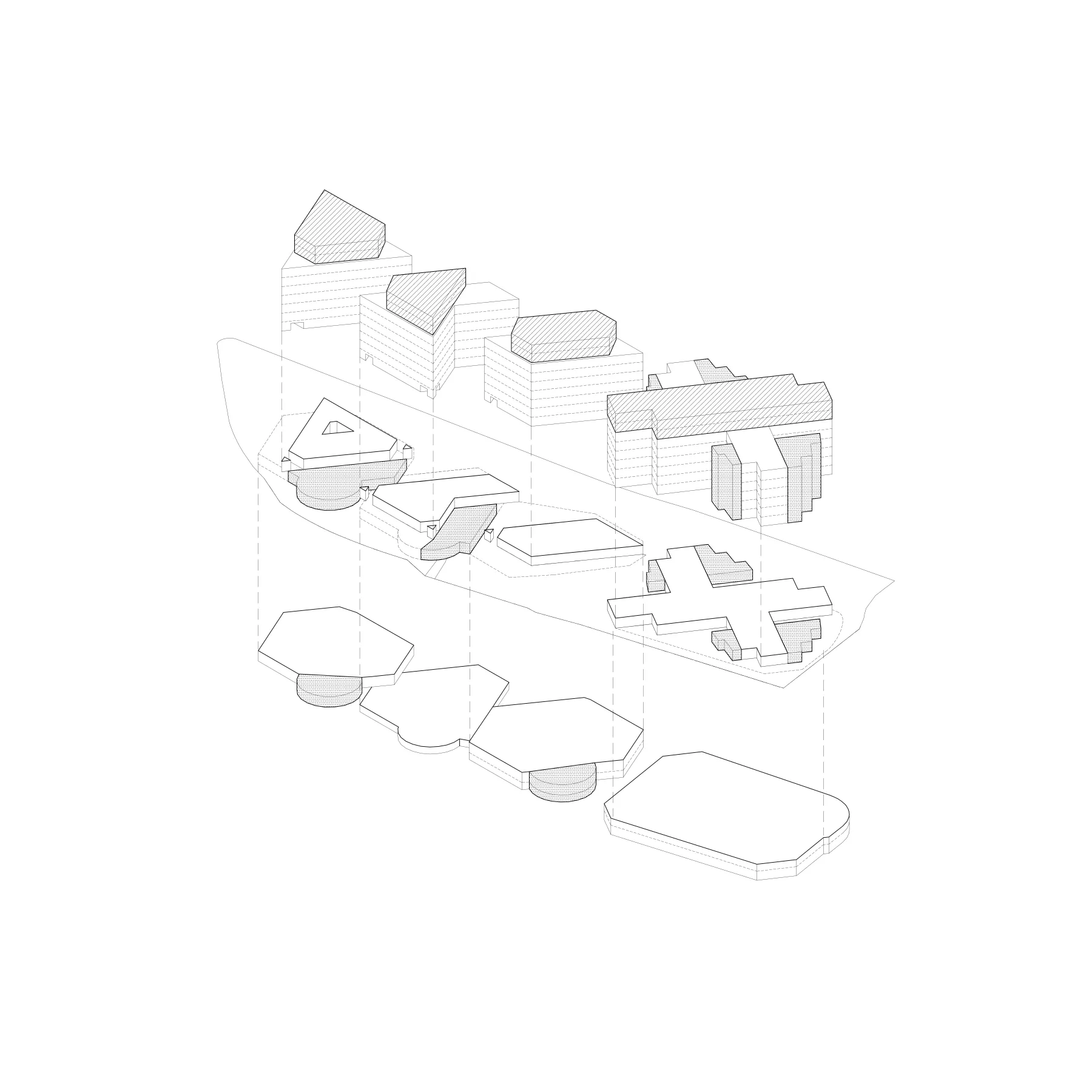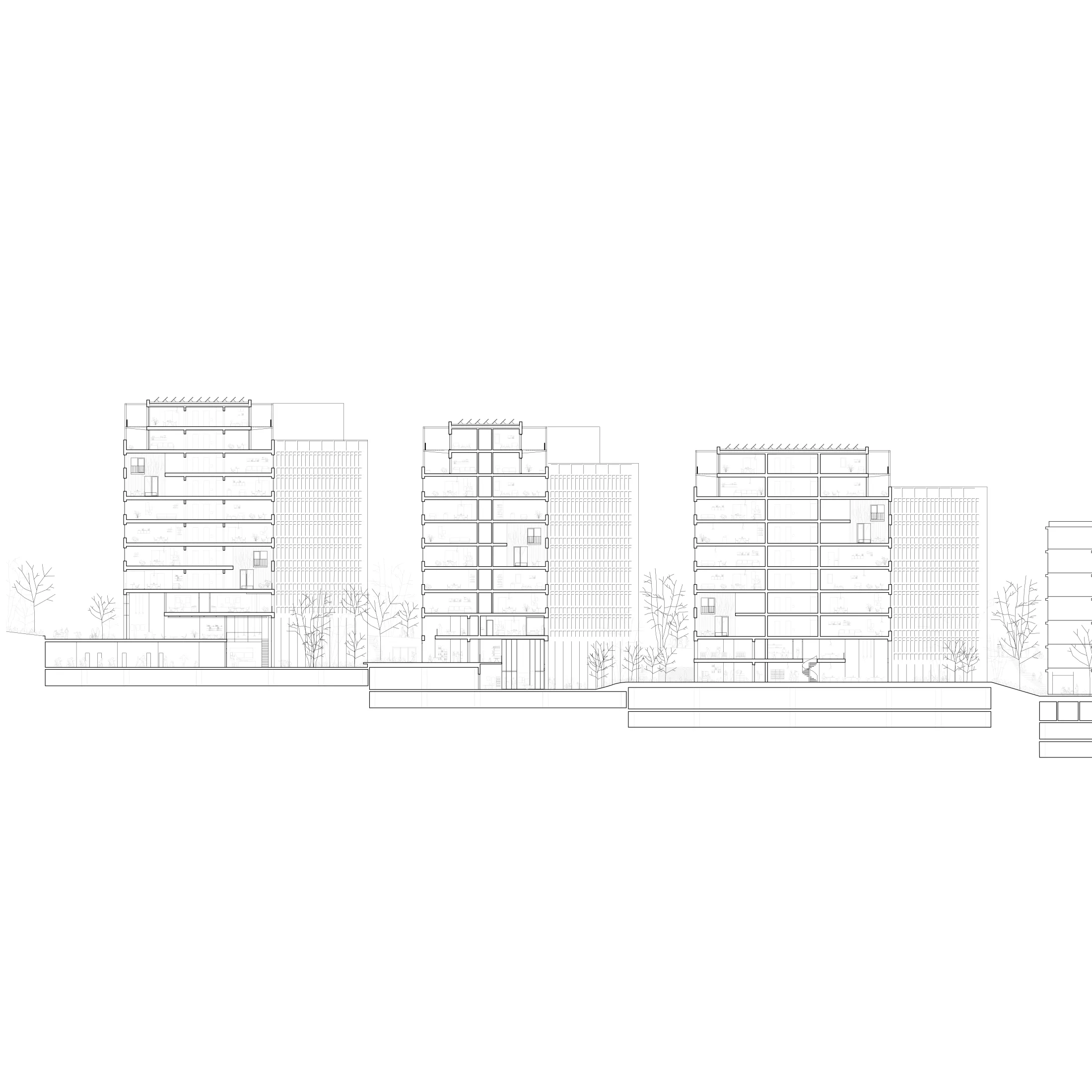 Four existing buildings, including the iconic Triangles by André Jacqmain, are repurposed into a housing-led, mixed-use development. The programme includes over 300 residential units, alongside co-working spaces, horeca, community services, and shared amenities. Underground levels are converted to host public facilities and logistics, while timber rooftop extensions offer generous family homes with panoramic views.
