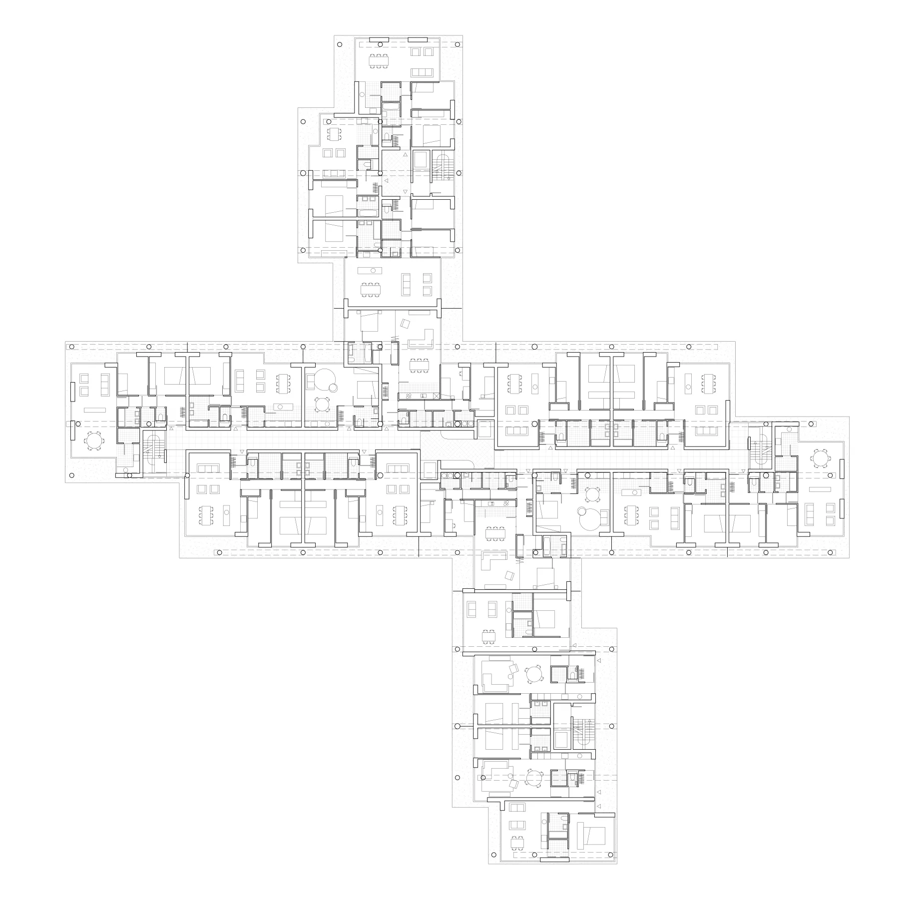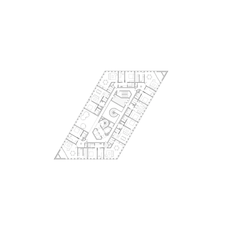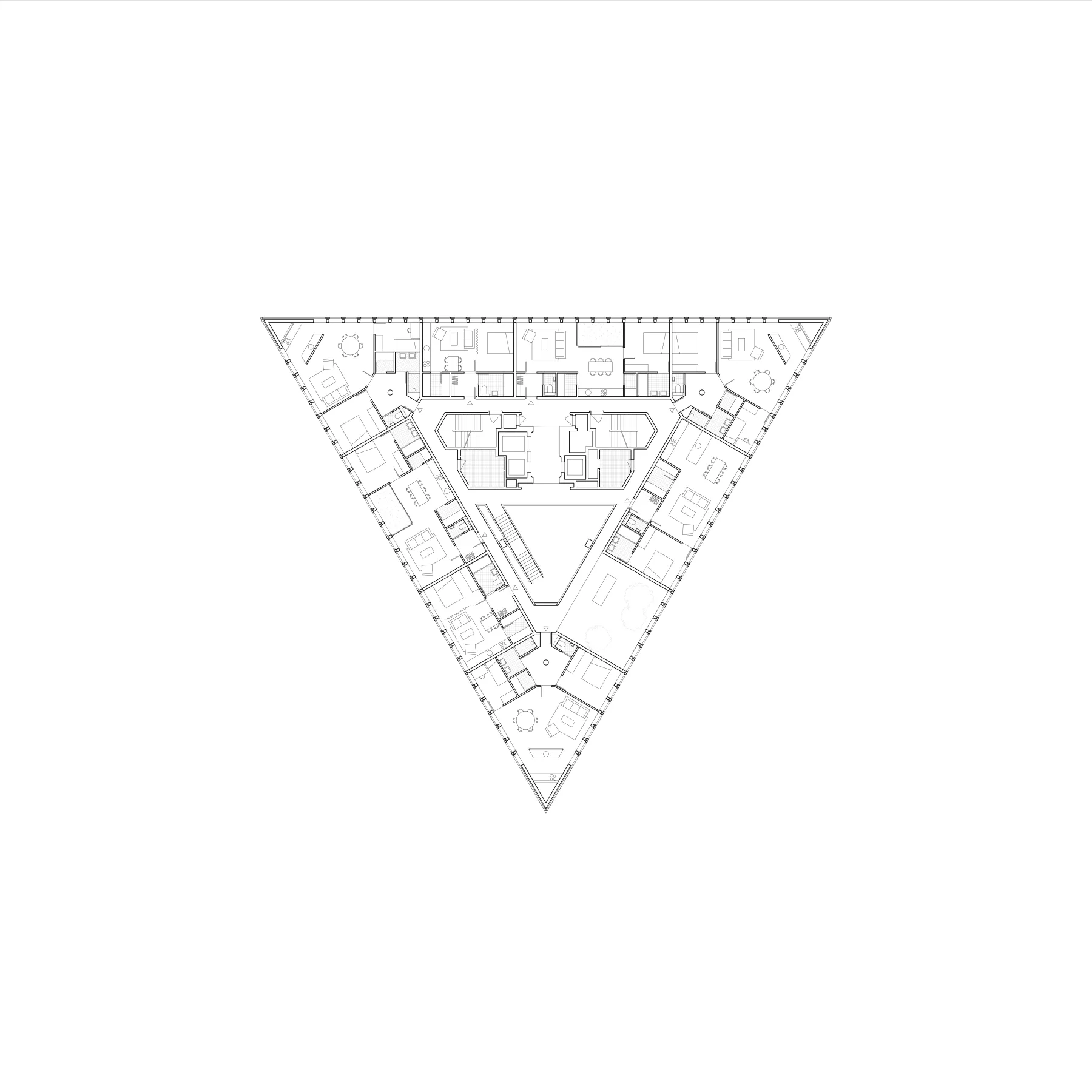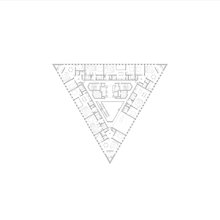Four existing buildings, including the iconic Triangles by André Jacqmain, are repurposed into a housing-led, mixed-use development. The programme includes over 300 residential units, alongside co-working spaces, horeca, community services, and shared amenities. Underground levels are converted to host public facilities and logistics, while timber rooftop extensions offer generous family homes with panoramic views.