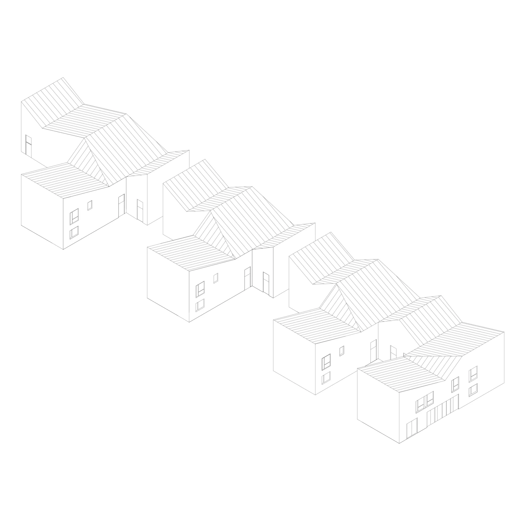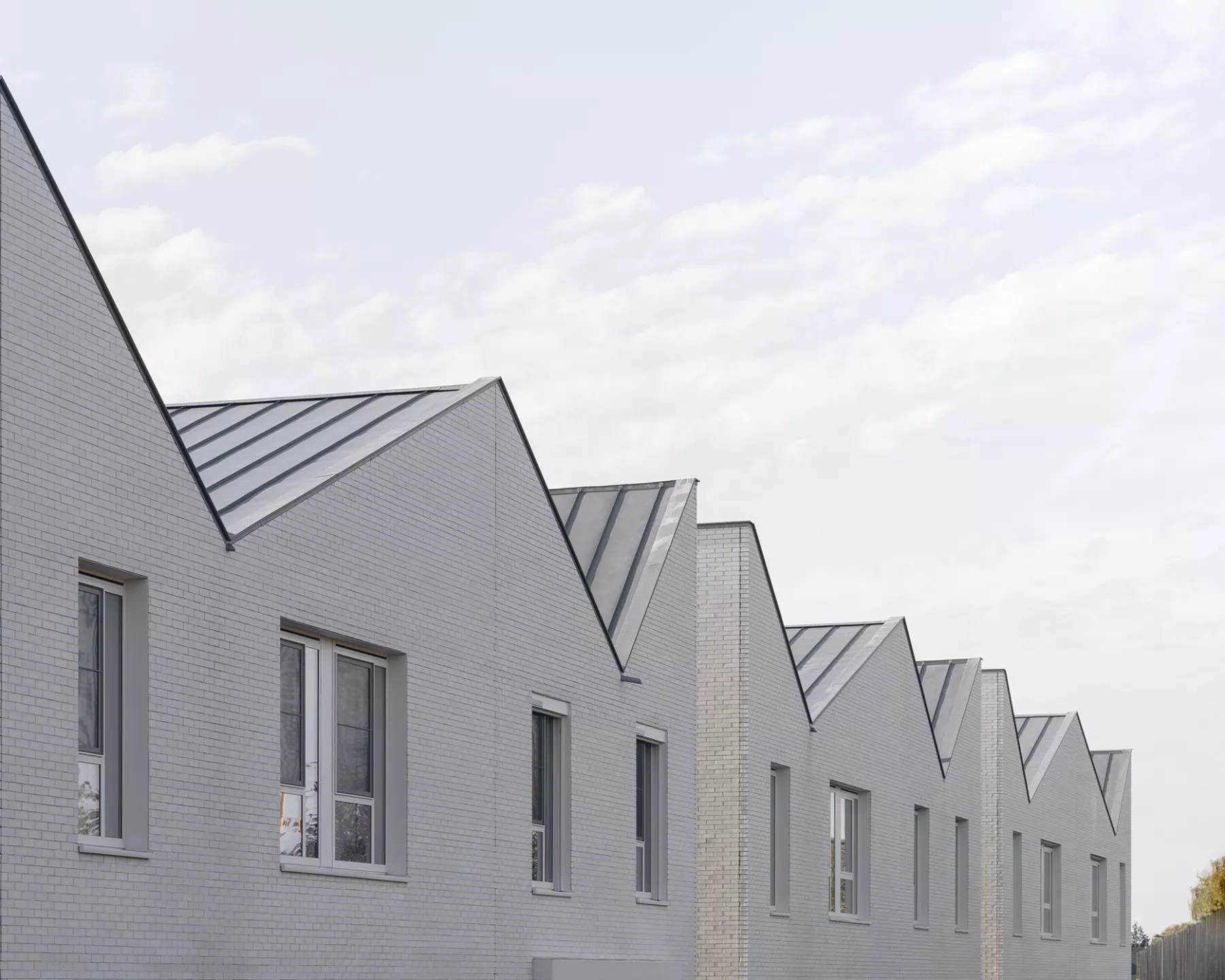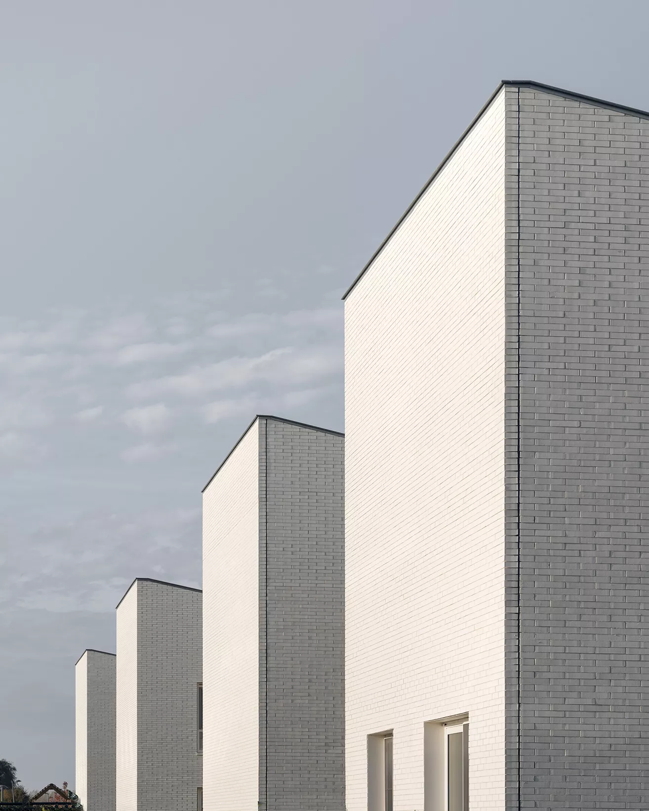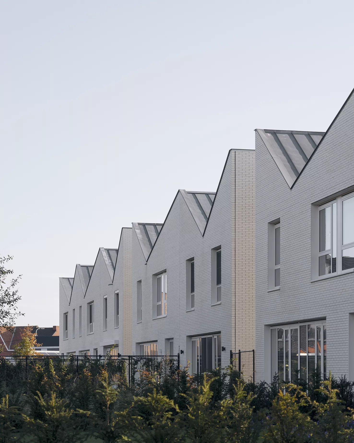 11 houses are built on the Merelbeke site on the outskirts of Ghent in response to the city's wish to densify its periphery. The houses are part of a larger-scale ensemble organized around a park. The light reflecting on the material gives the project an impression of low density. They attempt to respond to a search for a quality of life that respects the values of sharing within the neighbourhood.
