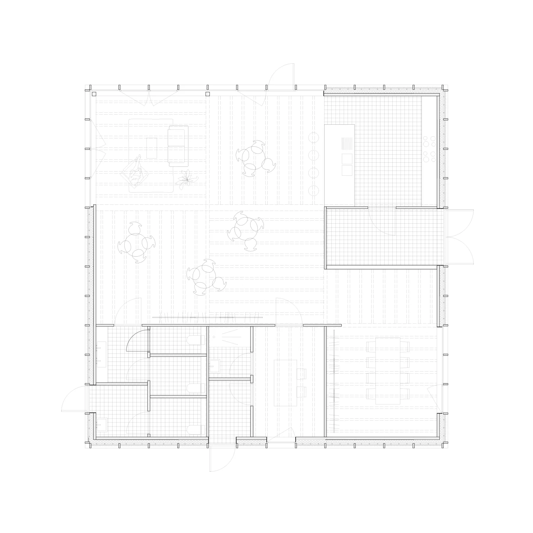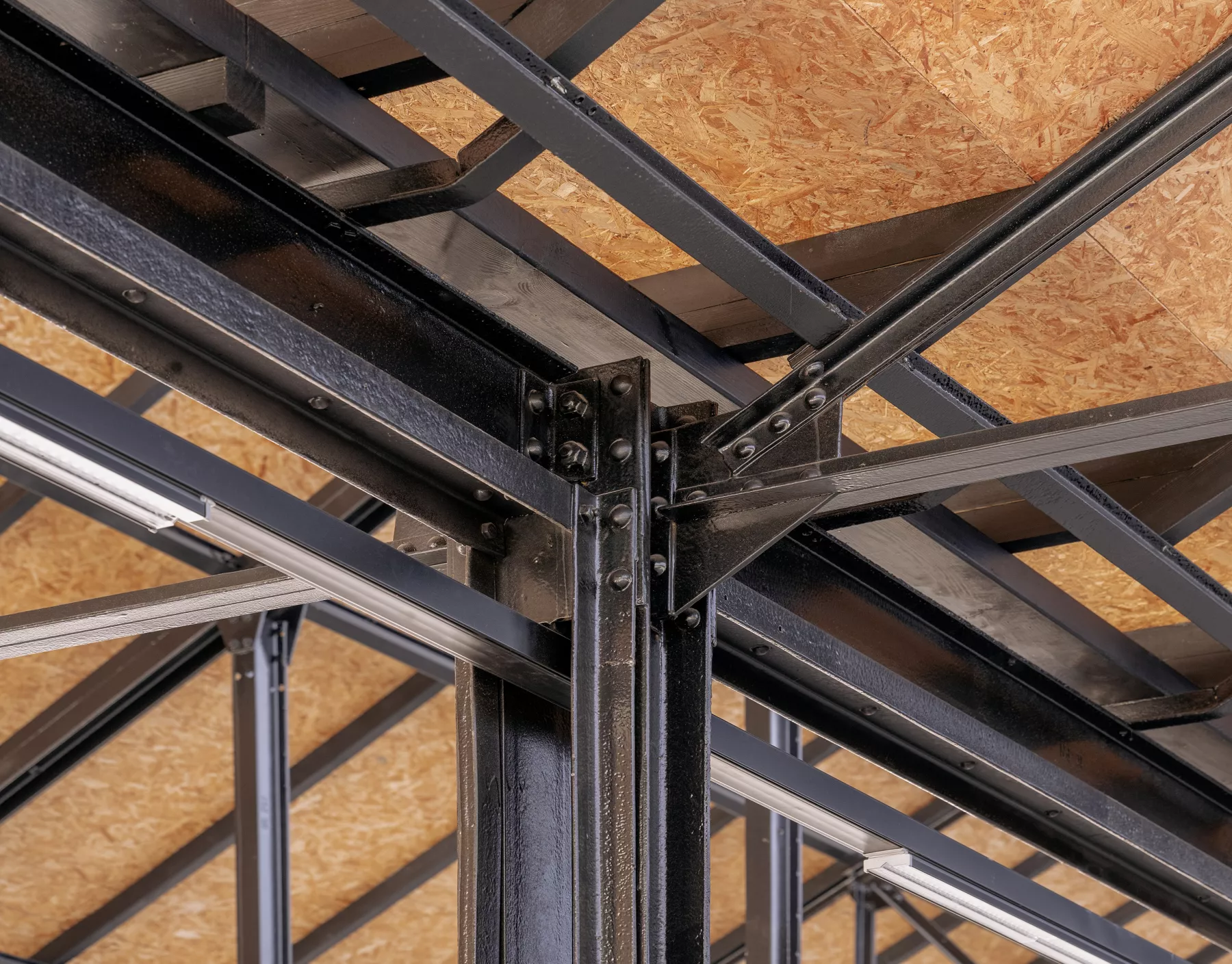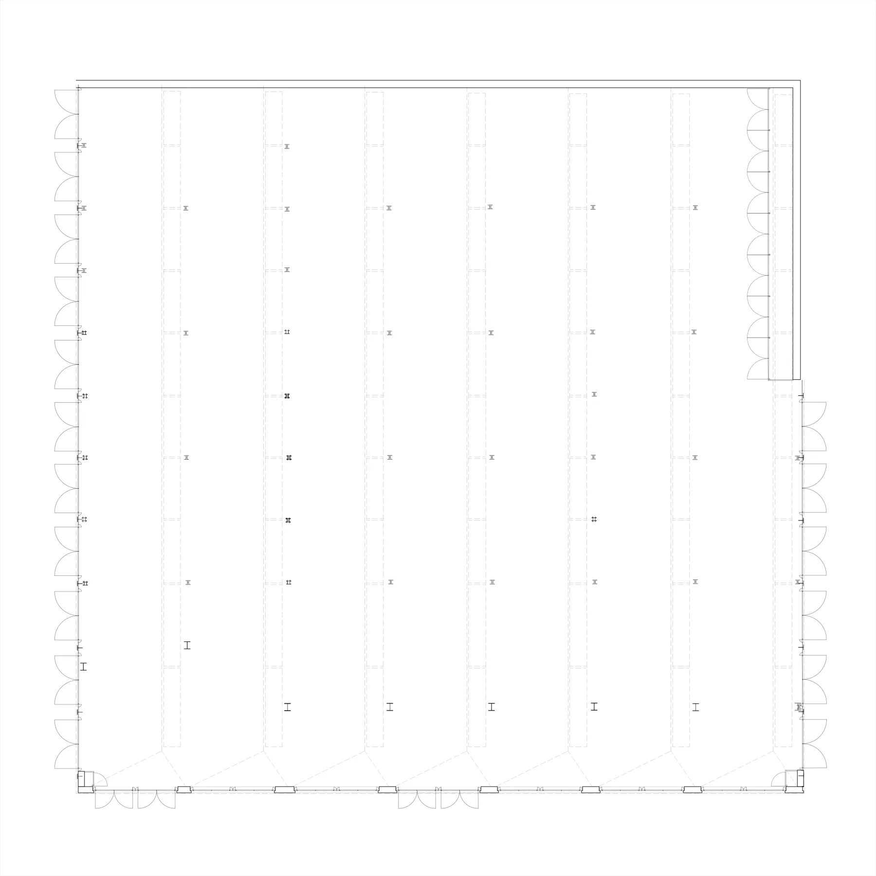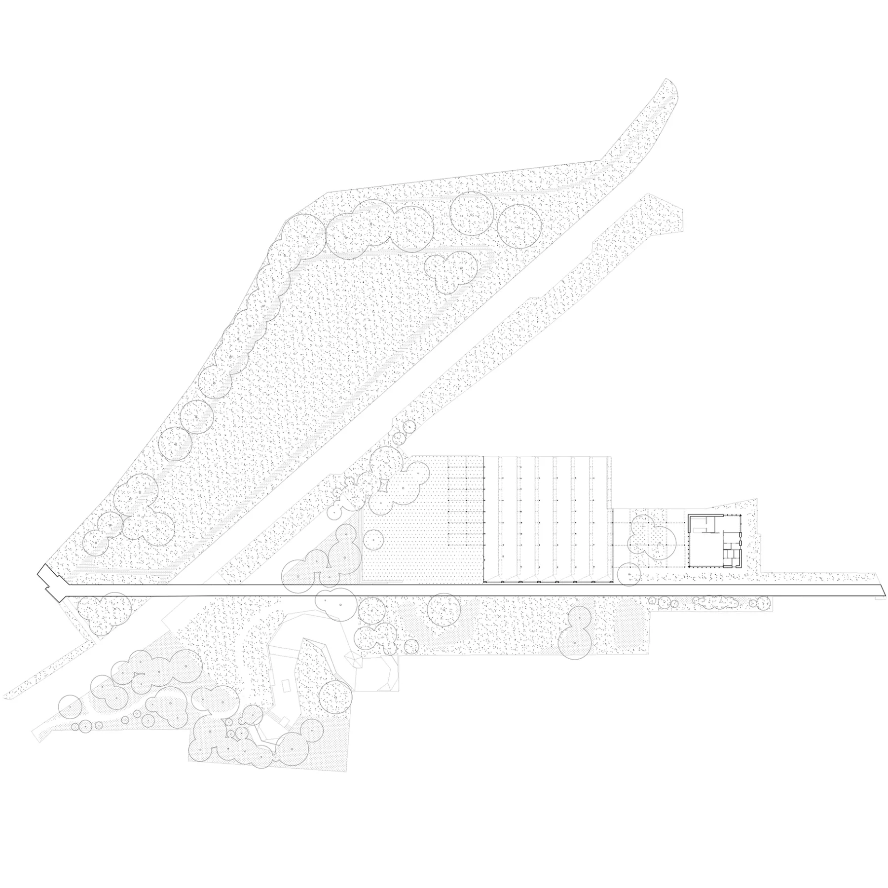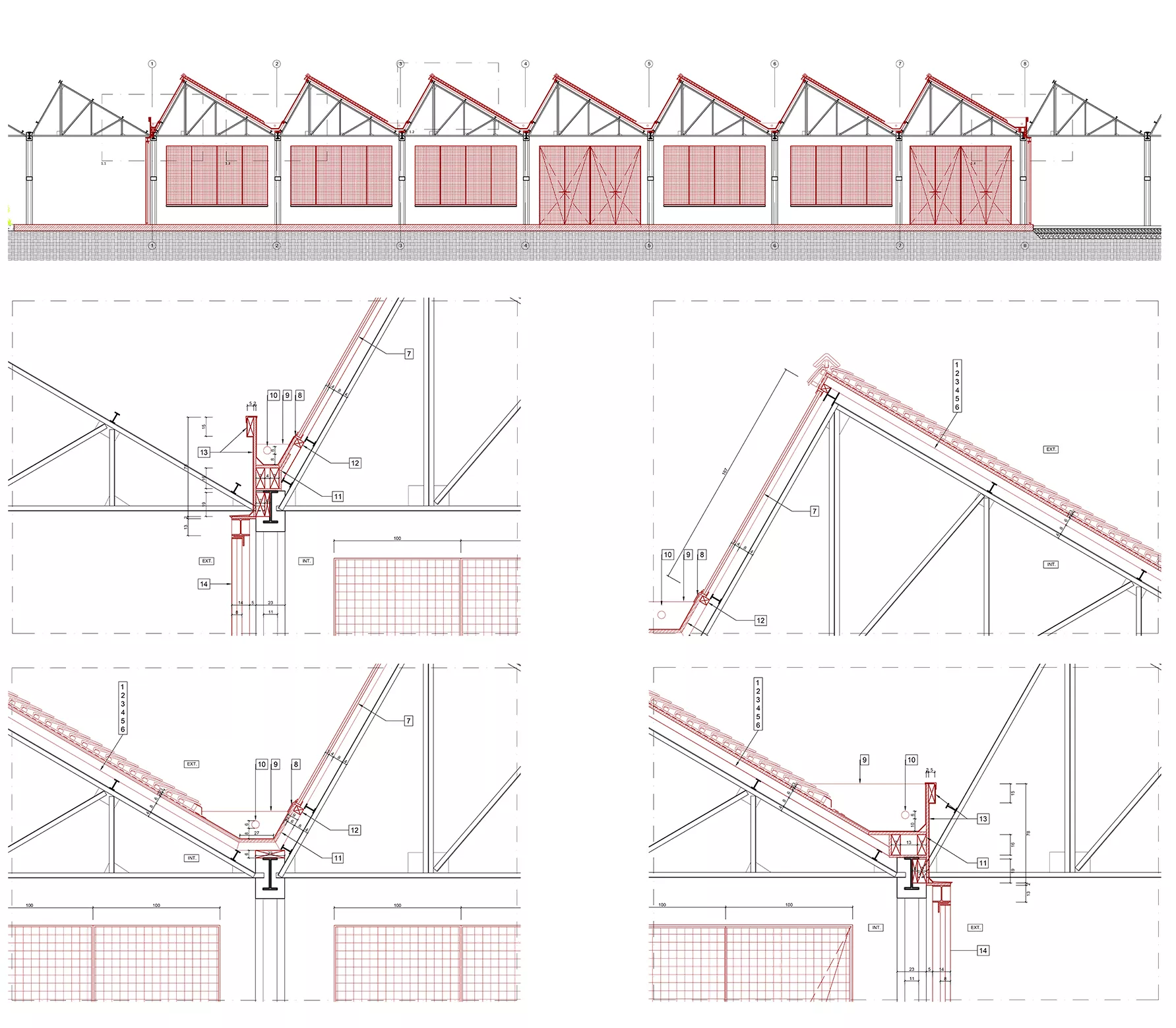 The existing metal structure will be retained and topped with a wooden roof. The hall's garden, composed of the exposed metal structure that allows wild plants to grow over it, will be treated to withstand weather conditions.