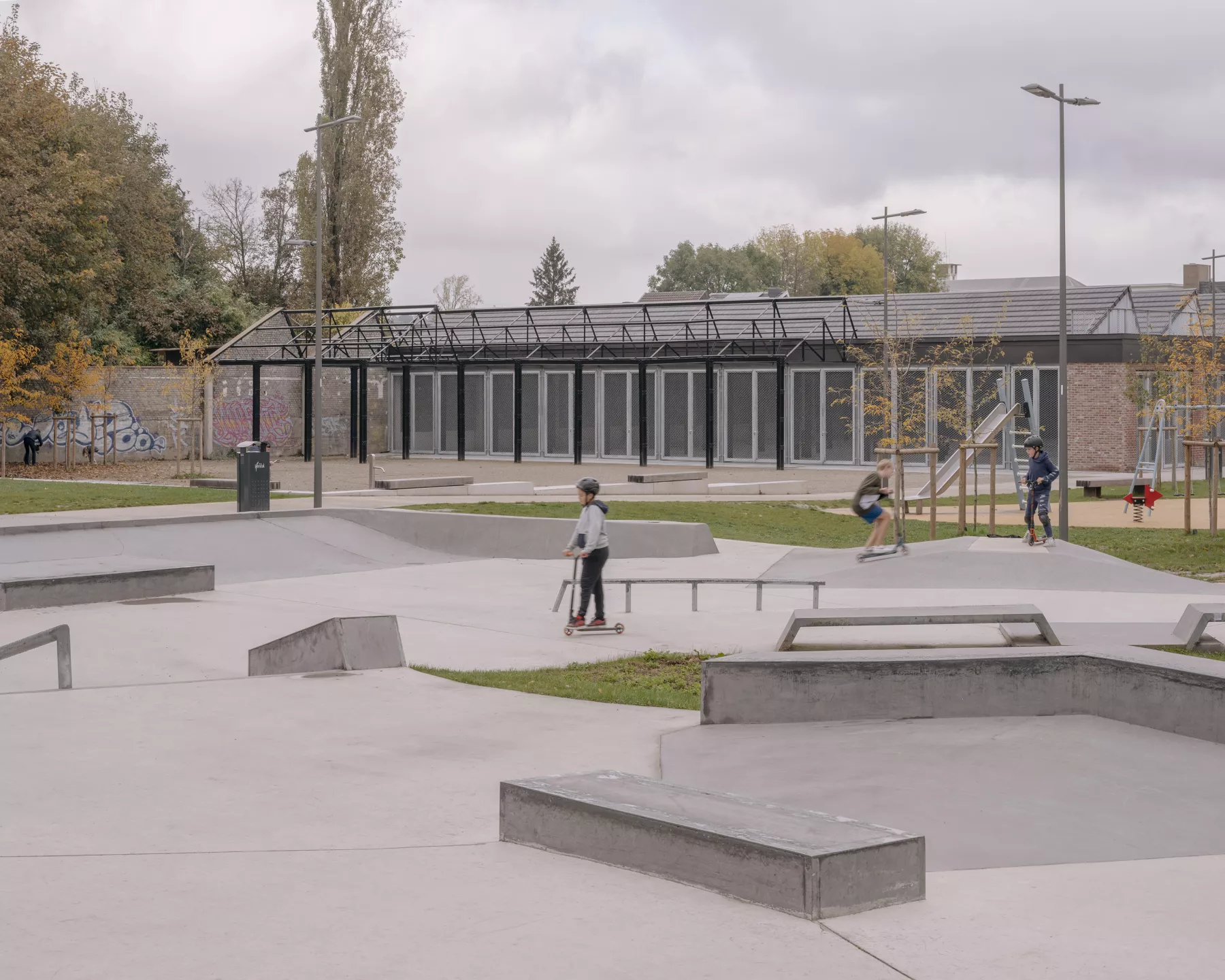 The new park is organized into different zones to accommodate various users, regardless of age or gender. Various activities are provided: a skatepark, a children's playground, fitness installations, picnic tables, a small forest, a square with a water fountain, and a flower garden. These park sections are situated along the pedestrian spine that traverses the site, free from any steps or obstacles.