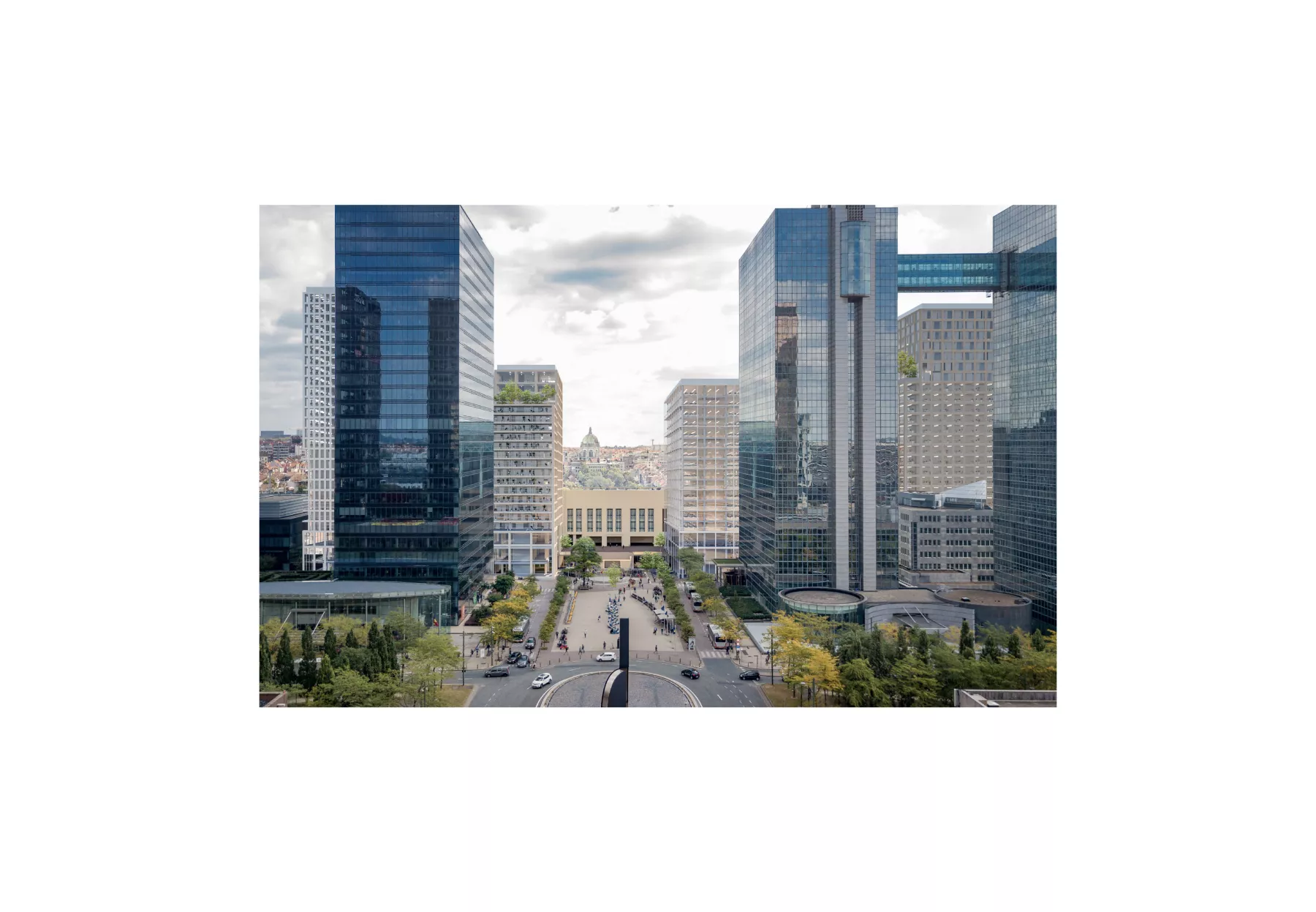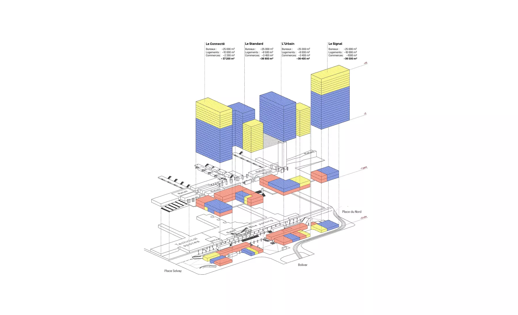 Four new landmark buildings structure the site, including a hub building integrating co-living or hotel units, co-working spaces, and retail. A sports park and student housing at Place Solvay energise the adjacent residential area, while green courtyards and a north-south axis ensure light, permeability, and quality of life.