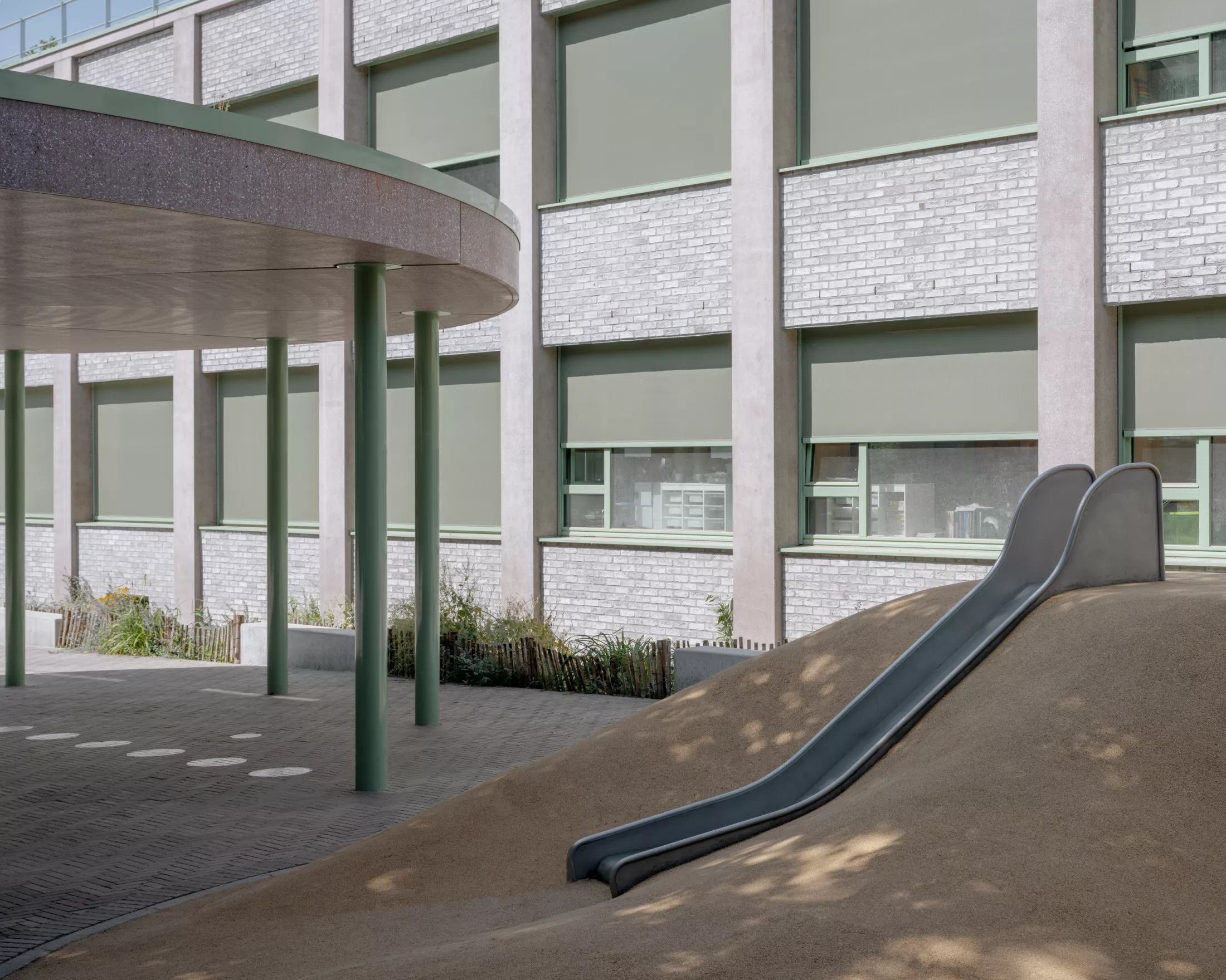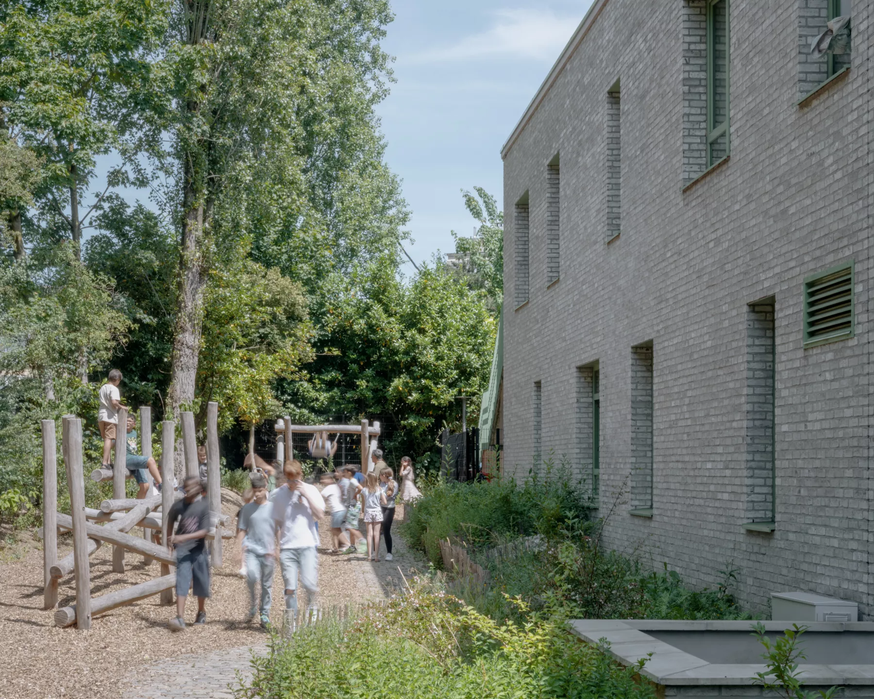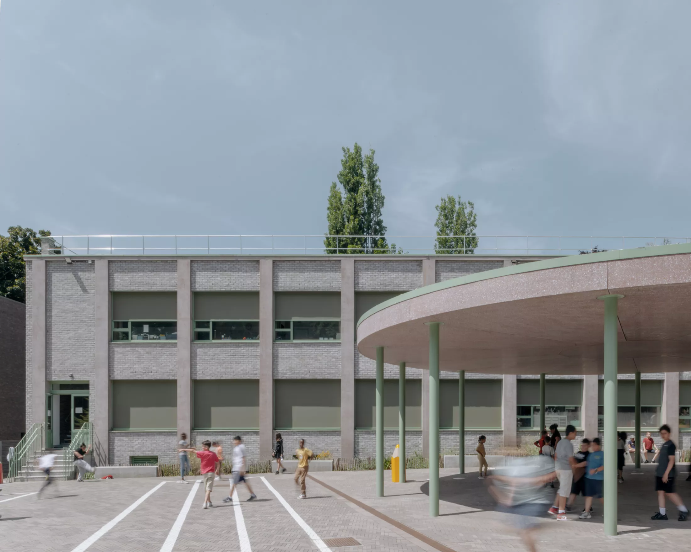 The renovation has been designed to maximize the recycling of the existing building in the renovation by limiting the demolition of the existing structure and working with a system of prefabricated insulated facade panels. This approach ensures both the sustainability and preservation of the building's original character while enhancing its energy efficiency and learning environment.