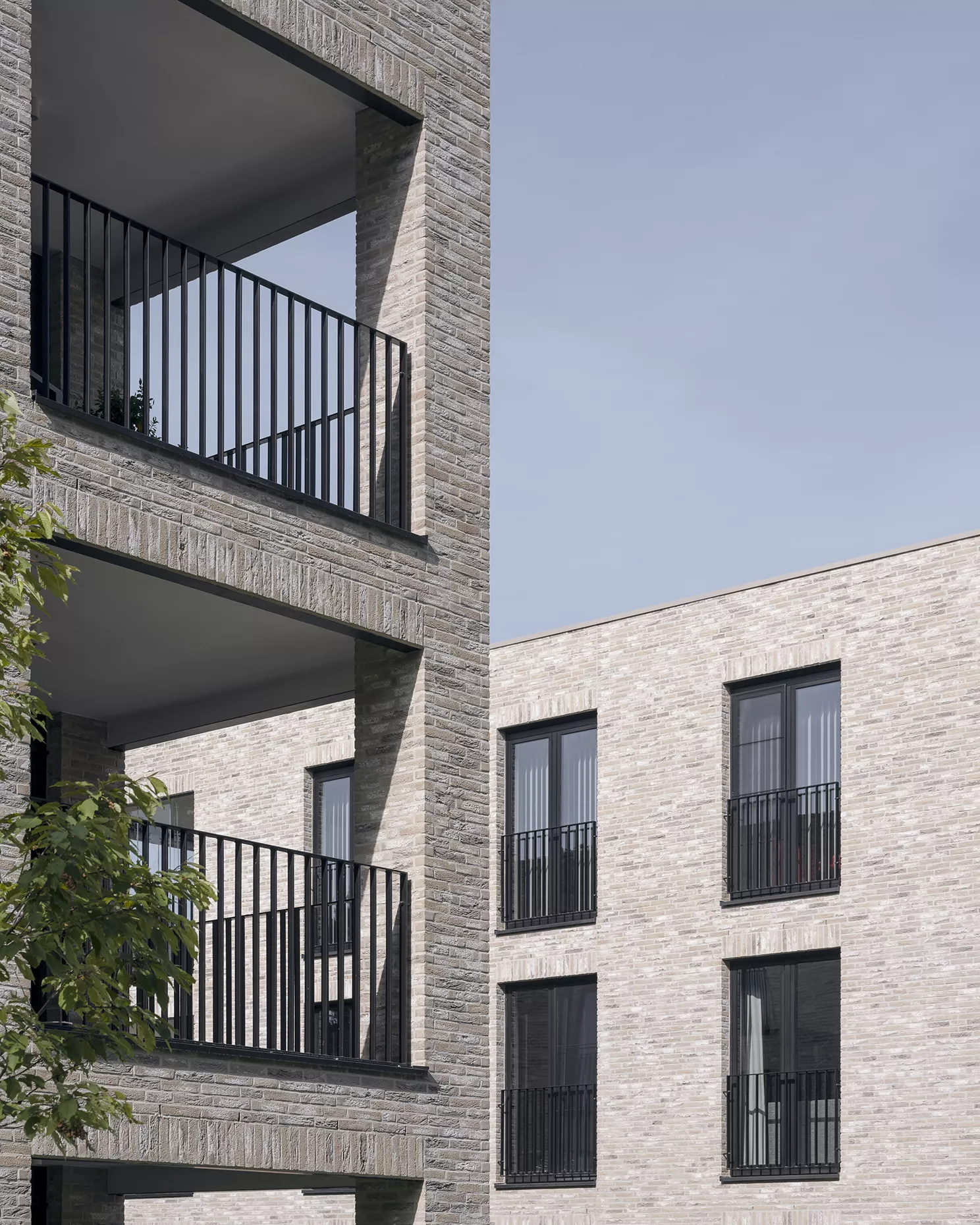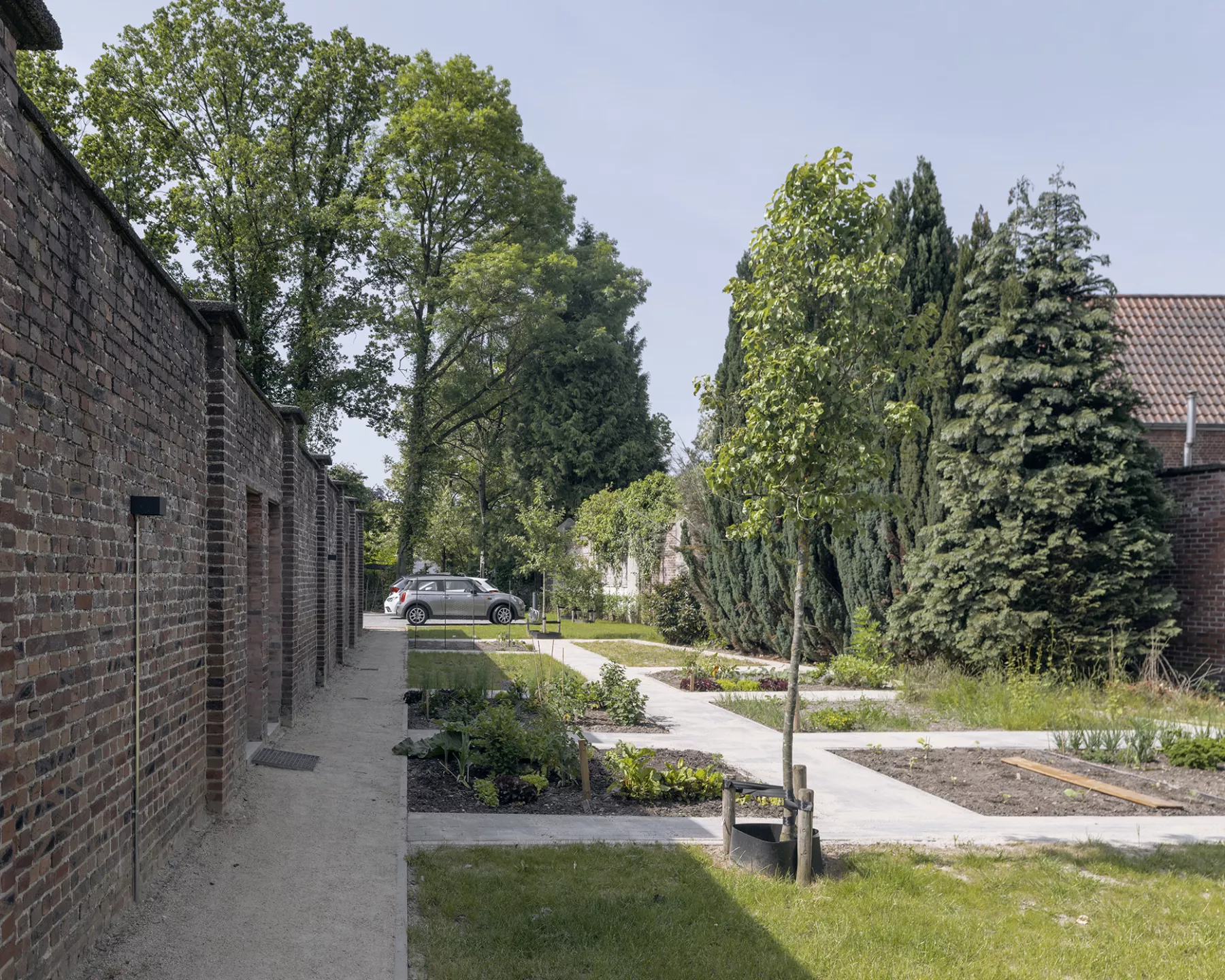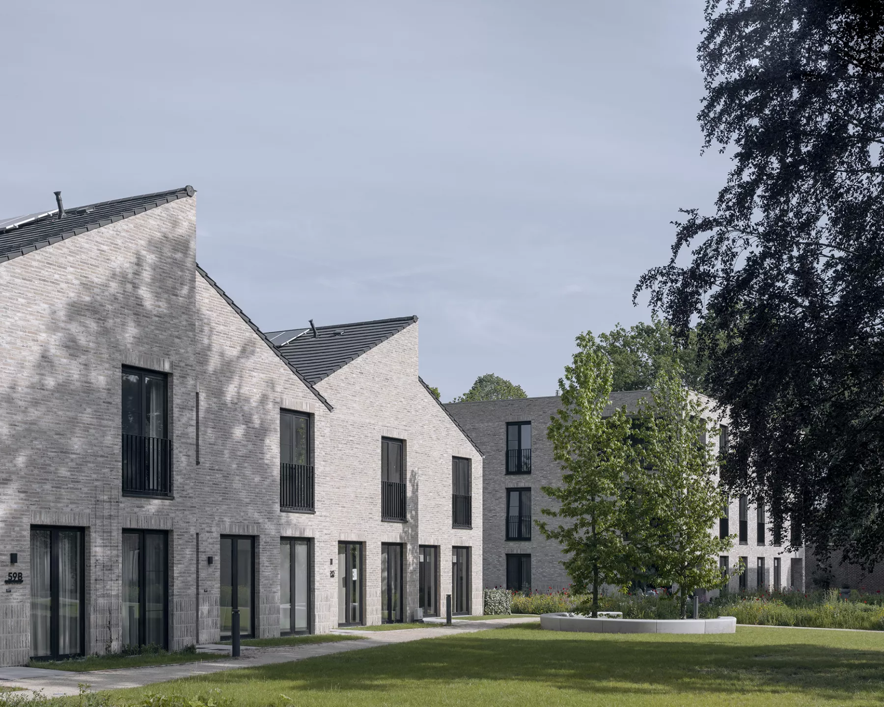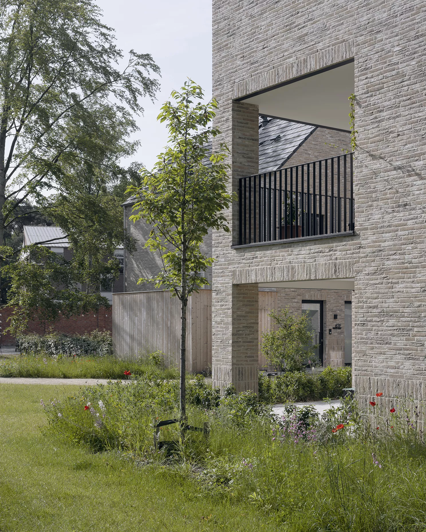 Situated on a former convent estate from the 1950s in Genk, the project encompasses 45 new homes. These residences are divided into three housing typologies: three apartment buildings, six three-level townhouses, and five two-level terraced houses, all nestled within the gardens of the former convent.