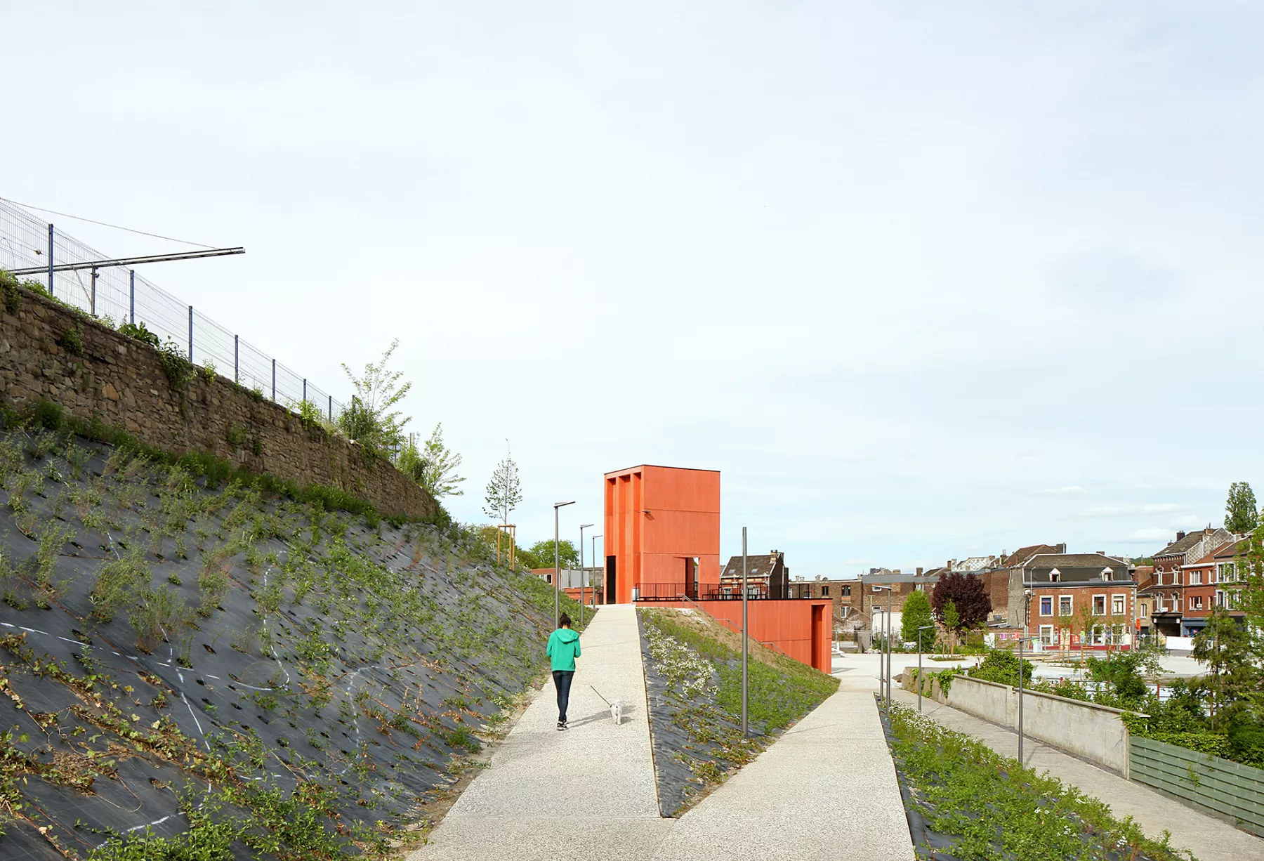 The new Marexhe Square recreates on different levels a strong link between the wooded hillsides on the heights of Herstal and the densely built-up lower town. The transformation of a residual space into a public park, the greening of the railway embankments and the maximization of vegetation on all public spaces have allowed this project to offer new landscaped spaces accessible to the inhabitants of the district, but also reinforced a link of the regional ecological corridor on the slopes of the Meuse valley.