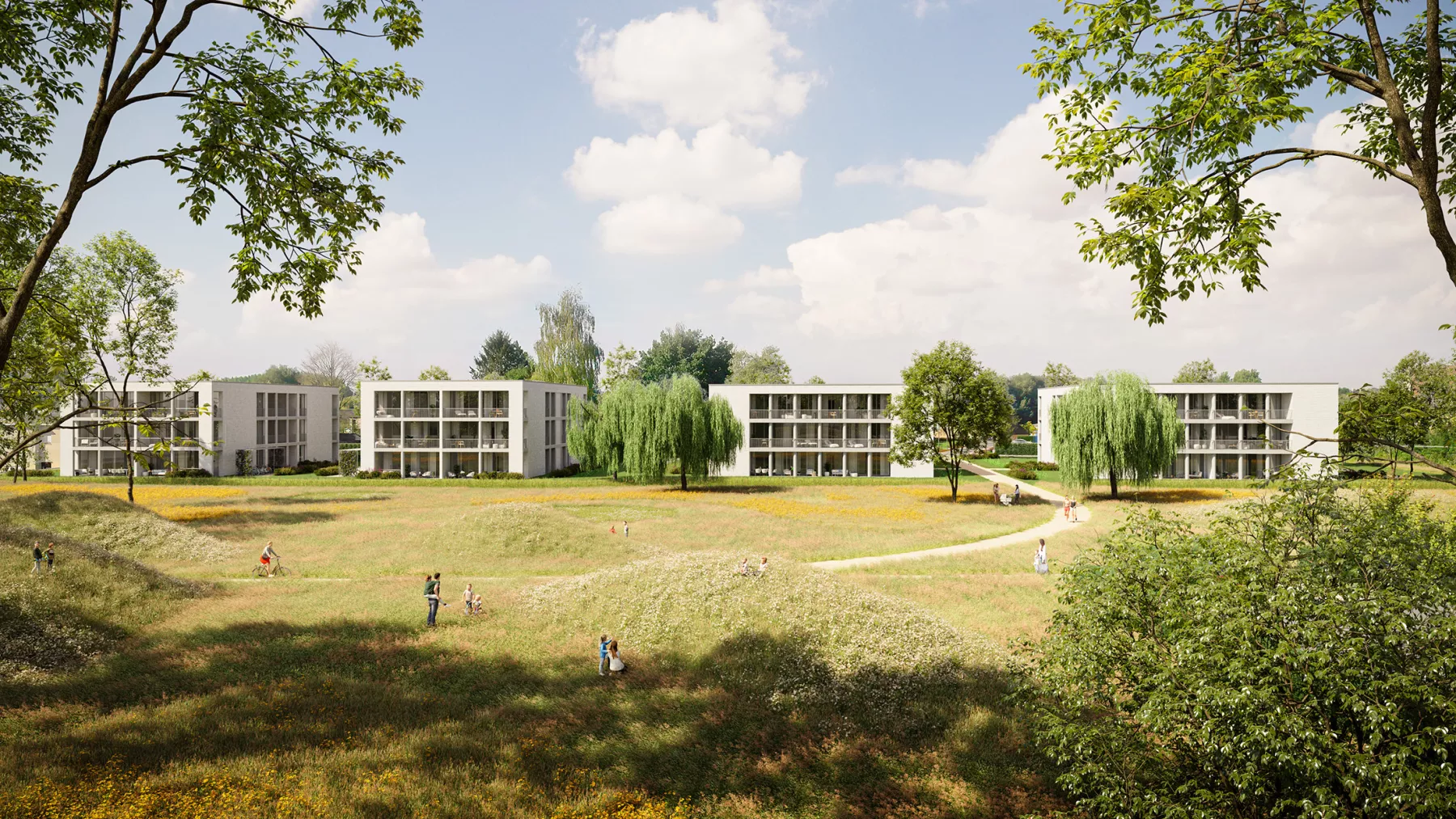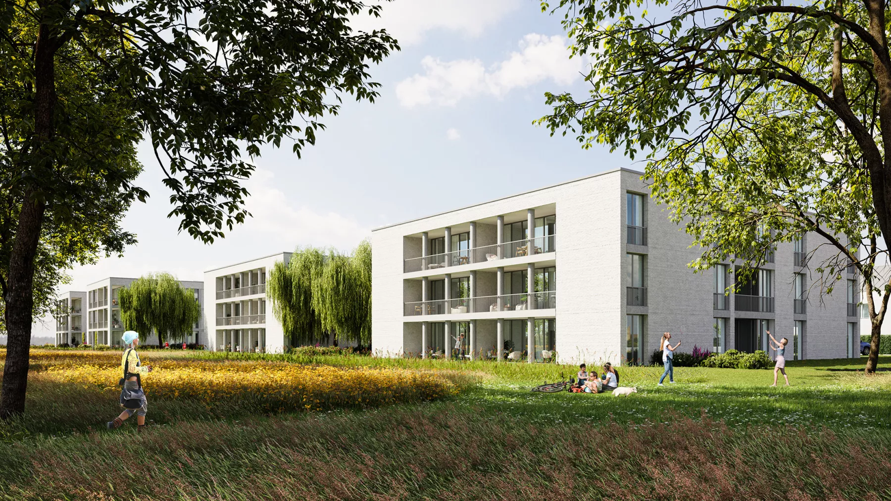 The facades of the different structures are designed uniformly, with special attention paid to the hierarchy between the street and the park. The single-family houses face the street, Lange Molenstraat in Lebbeke, harmonizing with the scale of the surrounding neighborhood, while the taller buildings feature large facades open towards the park. A new facade is also aligned with the park, incorporating a play of perspective and carefully thought-out framing on this green area.