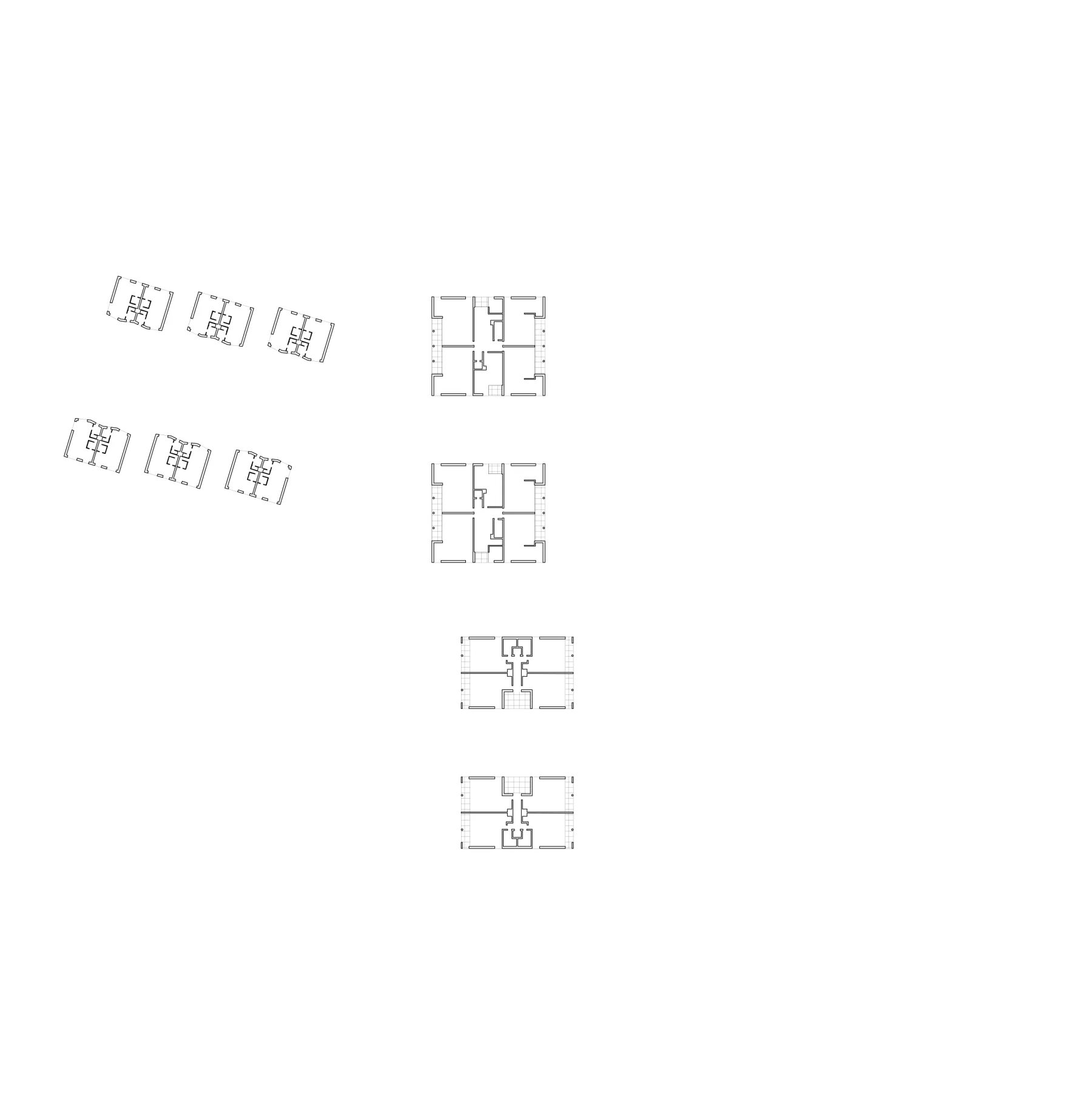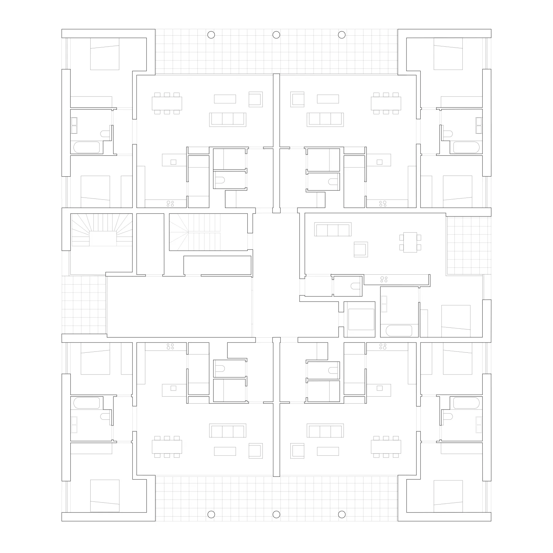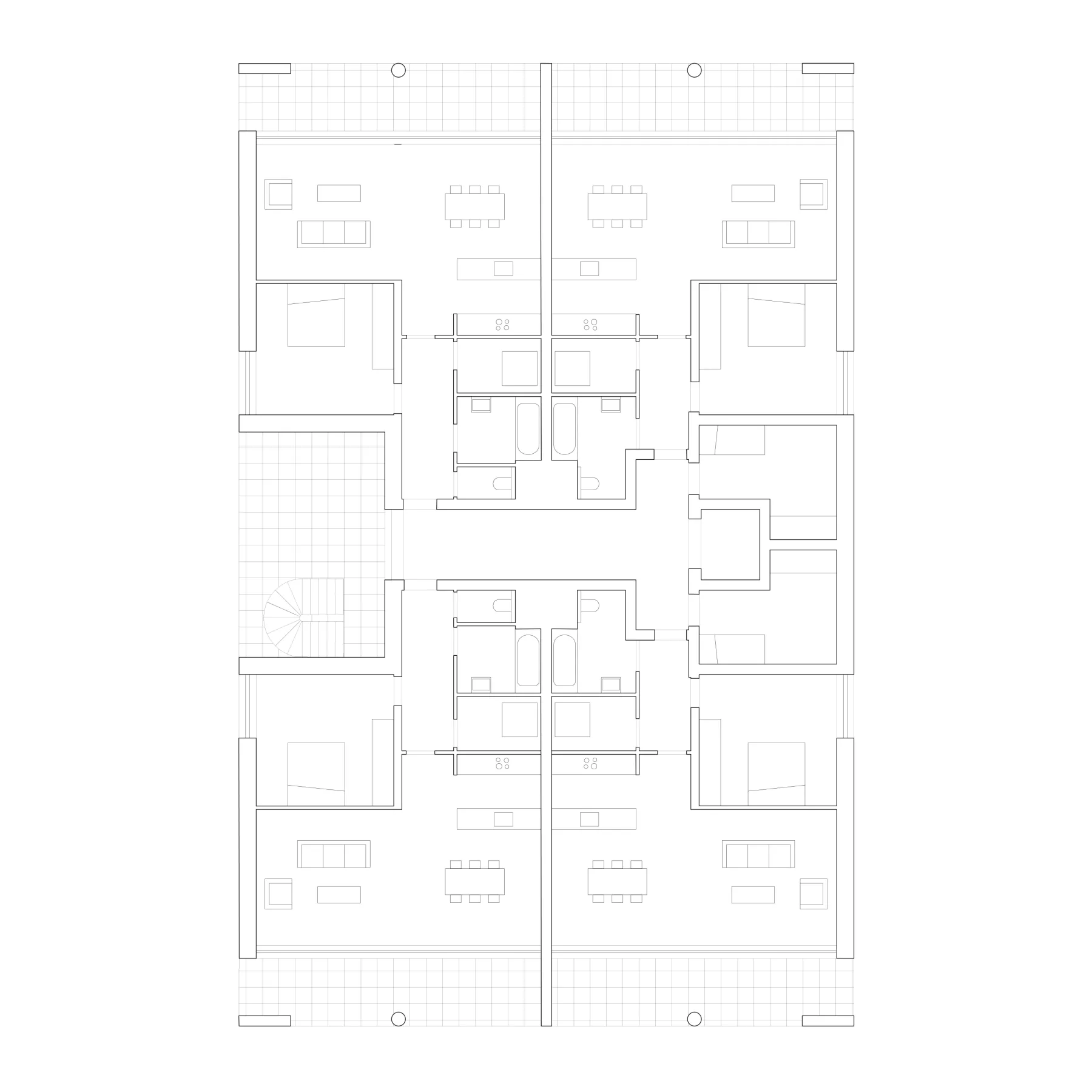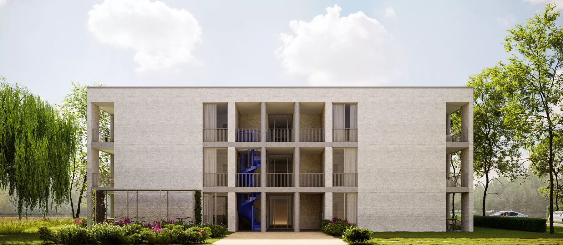Regarding the materials used, light concrete and white bricks prevail, enhanced by distinctive touches of blue. These blue elements are found in the block of 12 apartments with an exterior spiral staircase, the entrance of the block of 15 apartments, as well as on the awnings and carports of the single-family houses. These design and material choices contribute to creating visual harmony across the site, while establishing a fluid and respectful connection between the buildings, the street, and the adjacent park.