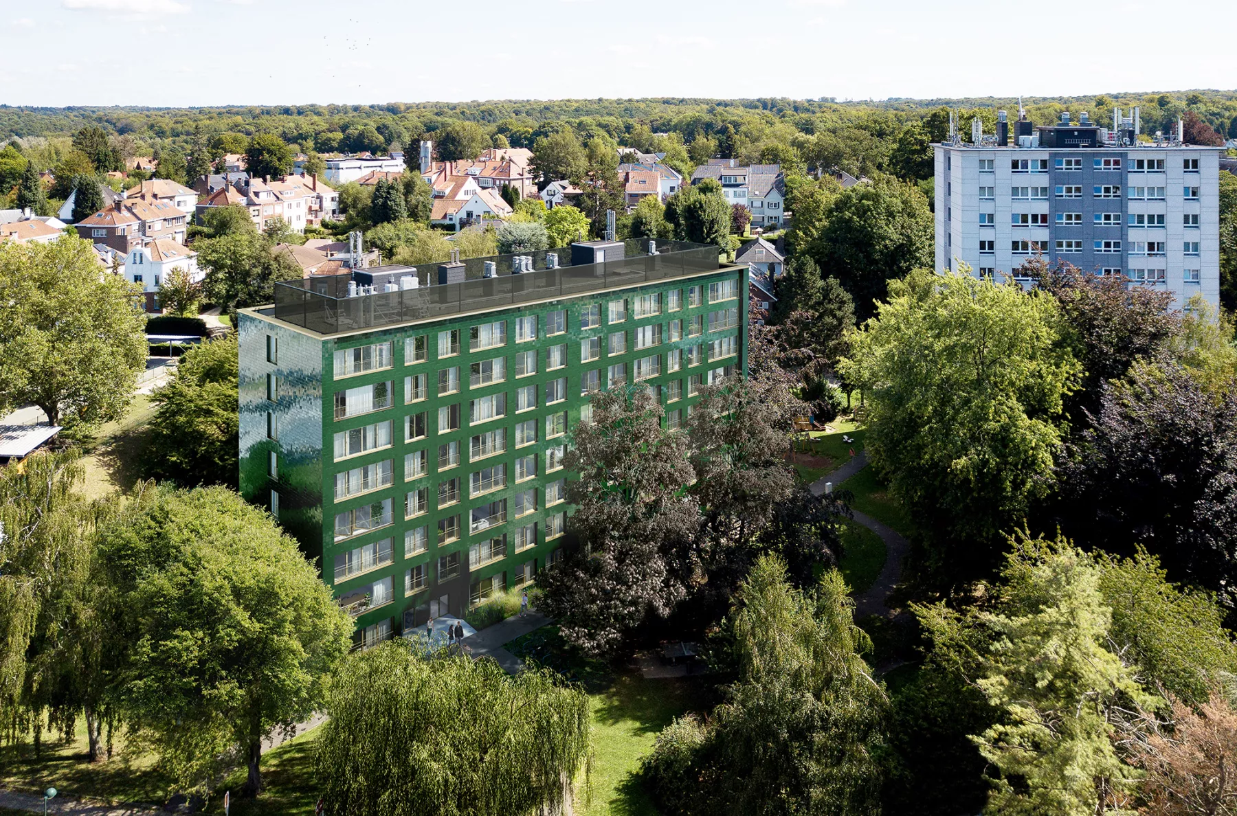 The building is clad in a new energy-efficient skin with a durable, tiled finish, reflecting a bold architectural choice. The shimmering material mirrors the shadows of nearby trees, illuminating the facade while maintaining the calm and poetic ambiance of the surroundings. These interventions are designed to improve the habitability of the dwellings while respecting the existing structure's identity.