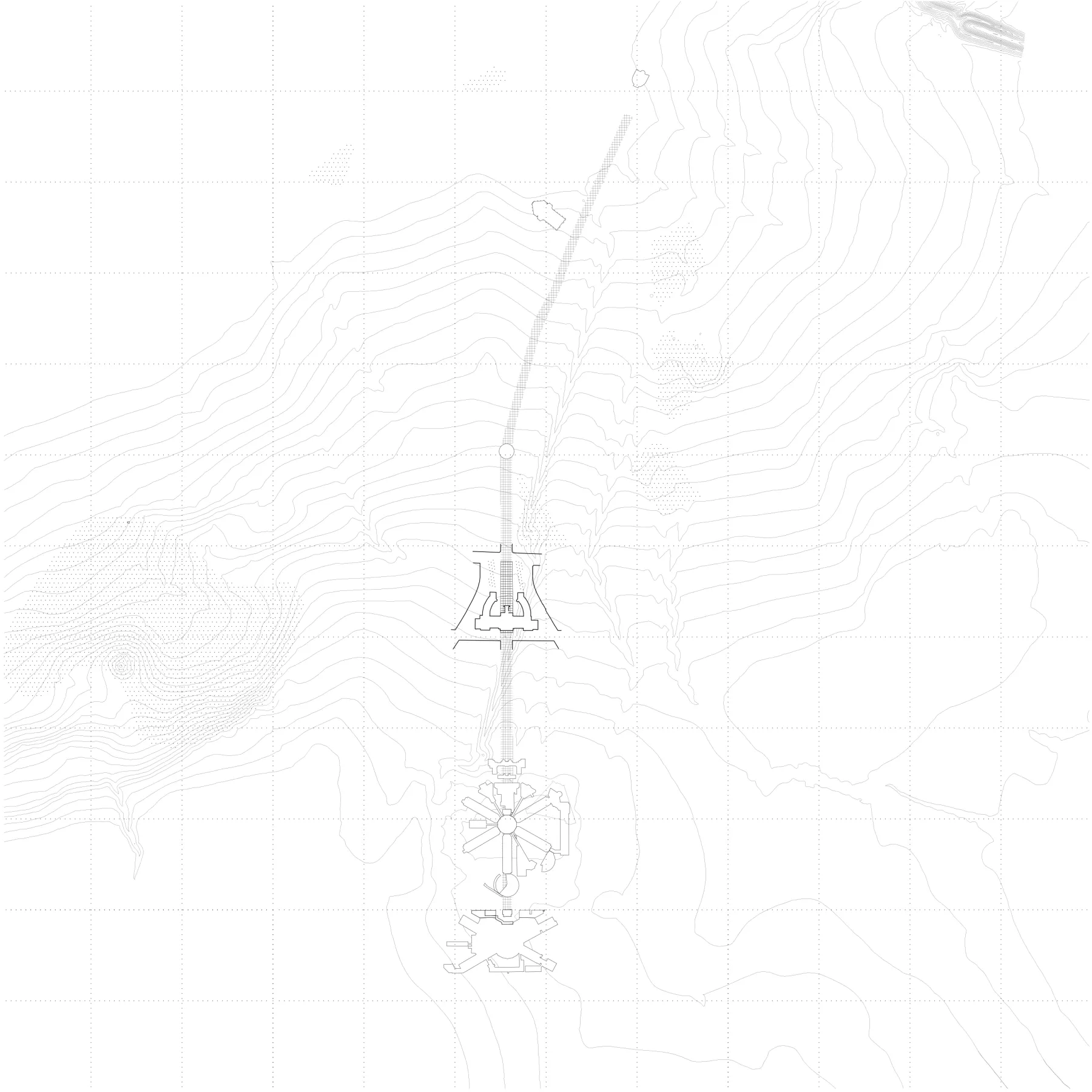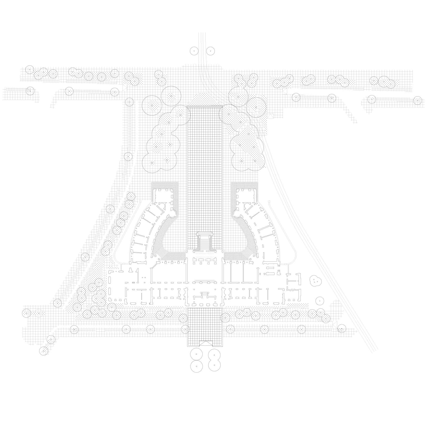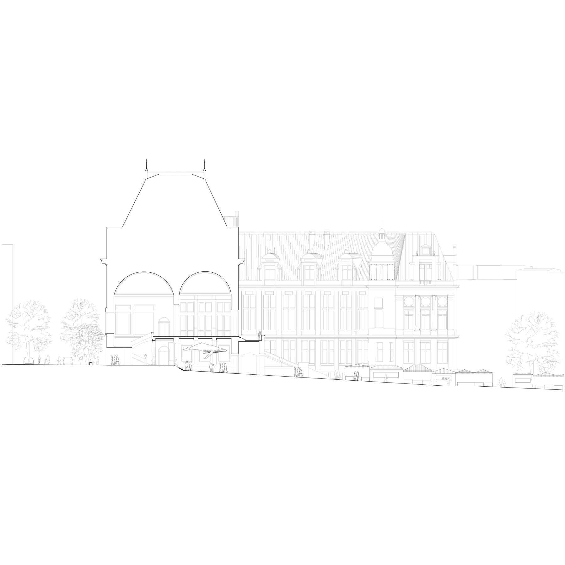 The converging space, envisioned as the "living room of the municipality," extends into the city hall, joining the Square to the north and the Garden to the south. Large flights of stairs connect this space to the town hall's bel-étage, which houses three large performance rooms: the wedding hall, the Europe Hall, and the Ceres Hall, overlooking the honor courtyard and the Square. The use of pink granite for the converging space mirrors the existing materiality of the town hall's footing area. The new Square's arrangement invites citizens to enter the building and explore its three ceremonial rooms, with the triptych square arrangement serving as a nod to the building's scenography.
