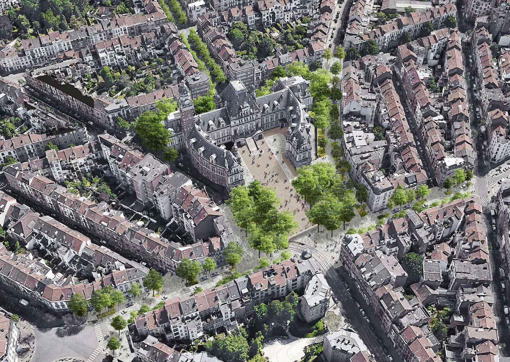 Located south of the Municipality Hall, the Garden reopens access to Rue de Savoie. This lesser-known entrance introduces new meaning through the longitudinal garden that runs alongside the facades, lending a welcoming atmosphere to the monumental building. This feature reinforces the landscaped and tranquil character of the upper Saint-Gilles neighborhoods while connecting with future prison developments.