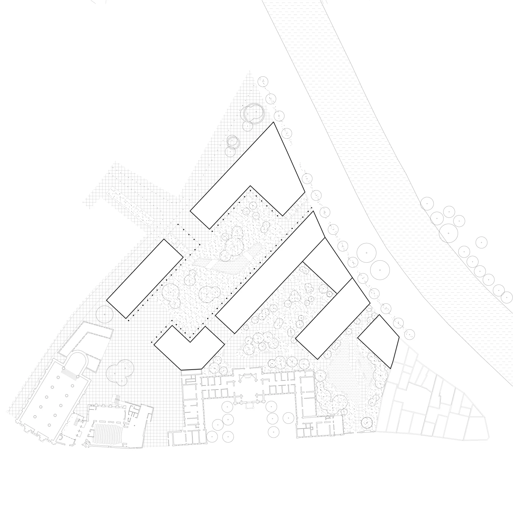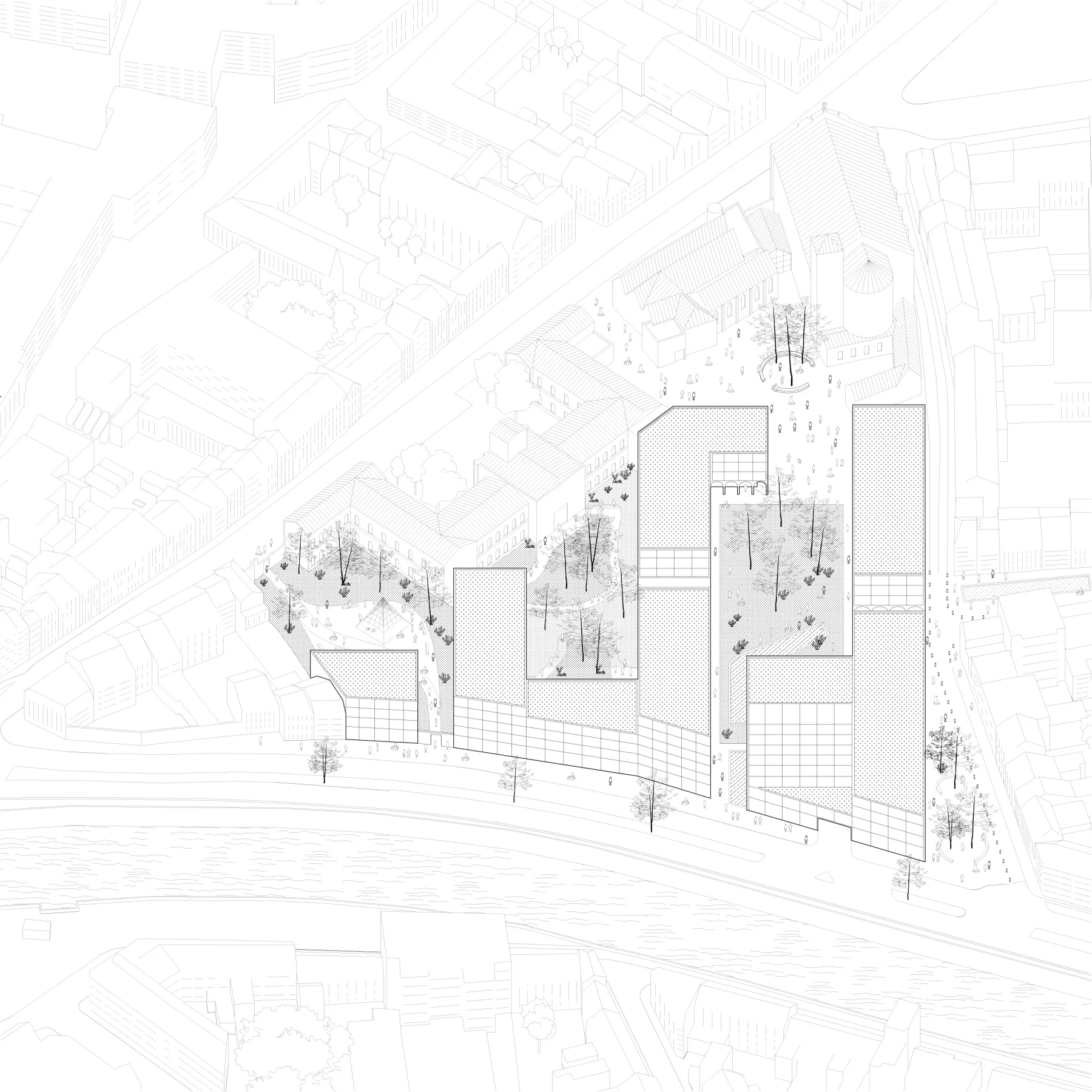 Moreover, the project aims to achieve a balance between urban density and providing various public or semi-public, predominantly green outdoor spaces. These outdoor spaces ensure the building block's integration and continuity in the urban fabric while enhancing the quality of life for local residents and users. The new gardens, parks, and neighborhood squares within the building block will improve the quality of life and bolster the site's integration into the city's ecosystem. It is crucial to approach this project with an eco-systemic logic, in both urban and social terms, ensuring it doesn't become a heat island and provides sufficient open space for trees and vegetation.